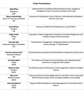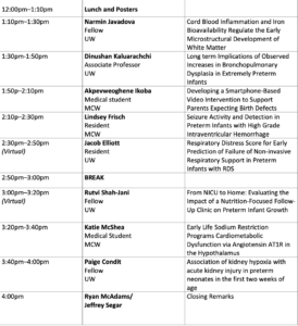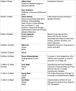 Started by neonatologists Dr. Ryan McAdams (University of Wisconsin School of Medicine and Public Health) and Dr. Jeffrey Segar (Medical College of Wisconsin), this annual event allows trainees and faculty to share their exciting neonatal research with the entire Wisconsin Neonatology community.